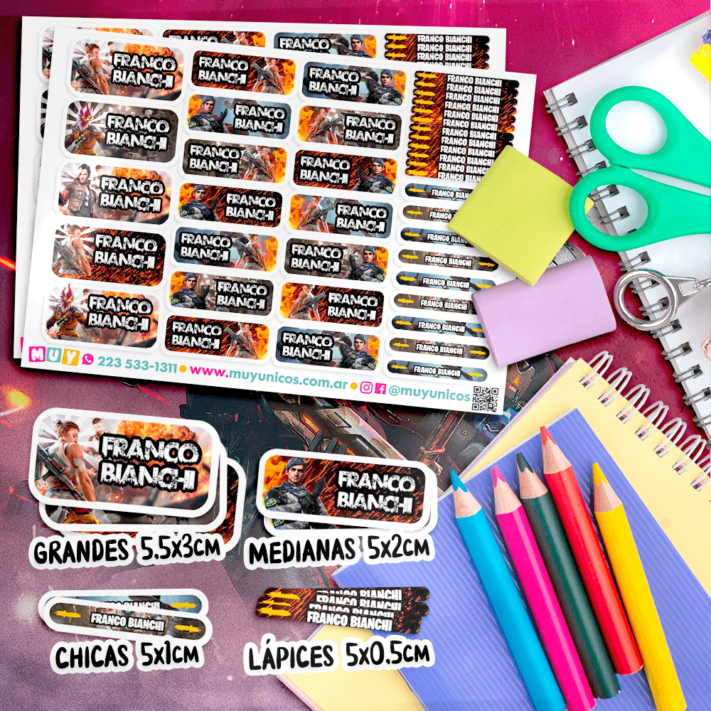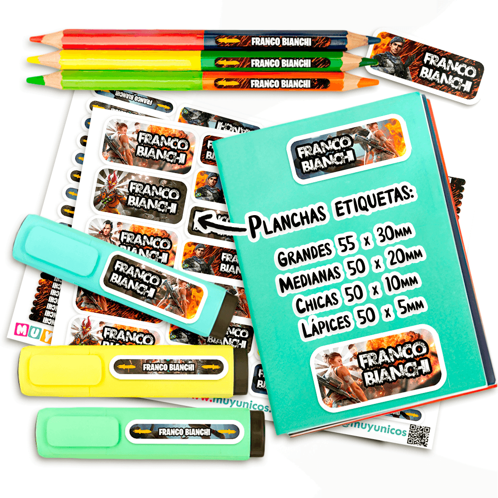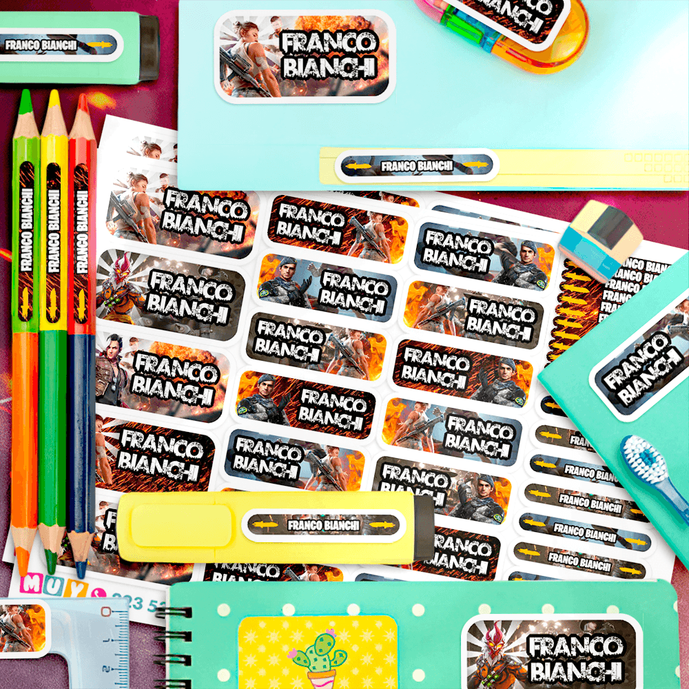 Recibe un kit de etiquetas escolares personalizadas con el nombre que elijas, listas para imprimir. Diseñamos este set a mano para ti y te lo enviamos en un archivo PDF. Este práctico archivo digital en formato PDF de 14 páginas te permite imprimir las etiquetas que necesites, en el tamaño que quieras y cuantas veces desees. Tu compra incluye: Más de mil etiquetas personalizadas de distintos tamaños, diseñadas para adaptarse a todos los útiles y objetos personales. Etiquetas (5×3 cm): Ideales para cuadernos, carpetas, estuches, mochilas y loncheras. Etiquetas (5×2 cm): Perfectas para reglas, marcadores gruesos, sacapuntas, agendas y pegamento…