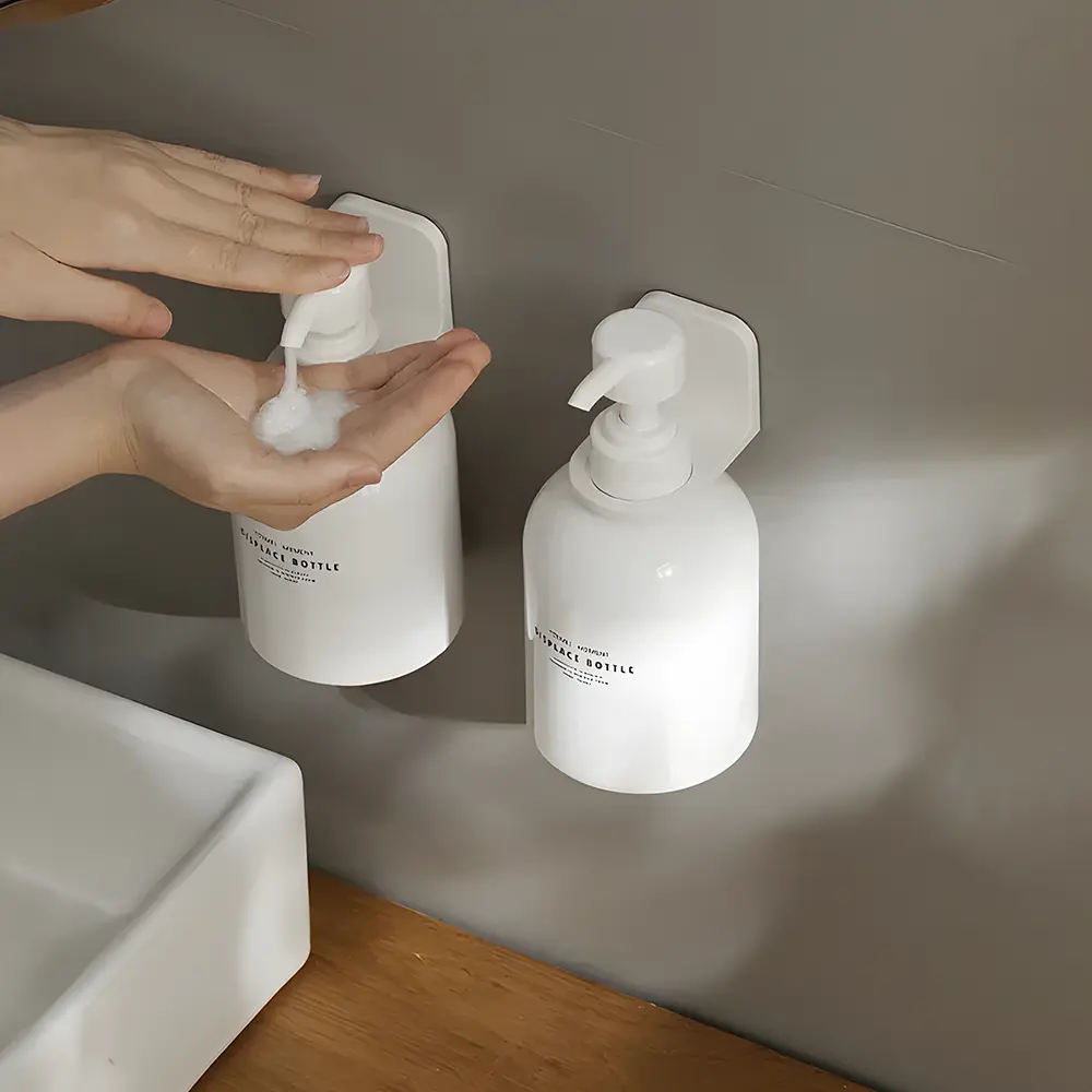Portabotellas dispensador adhesivo blanco El paquete incluye: 1 Juego de portabotellas ajustable Diseño montable en la pared, sin necesidad de taladrar. El soporte de una pieza viene con un adaptador adicional, adecuado para casi todas las botellas.